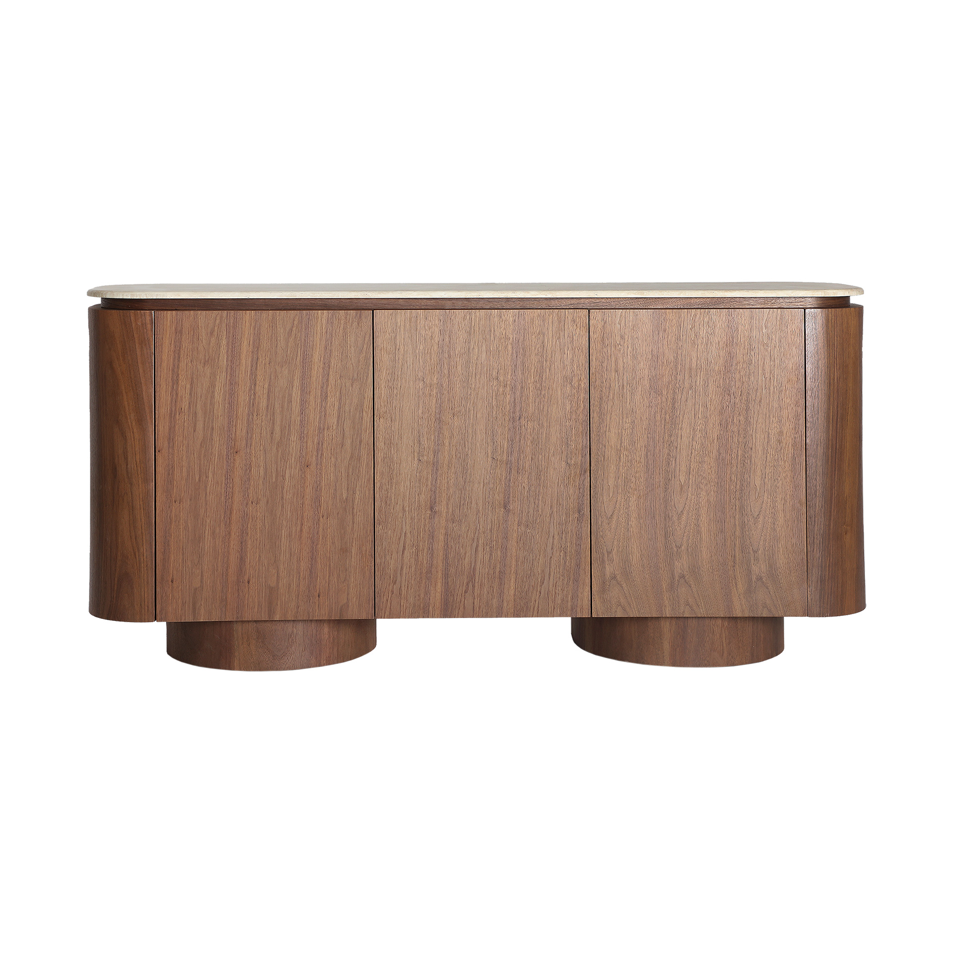 Aparador Dune de estilo contemporáneo, fabricado en mármol sintético en color beige, combinado con madera dm en color marrón y chapa de nogal. Producto desmontable.