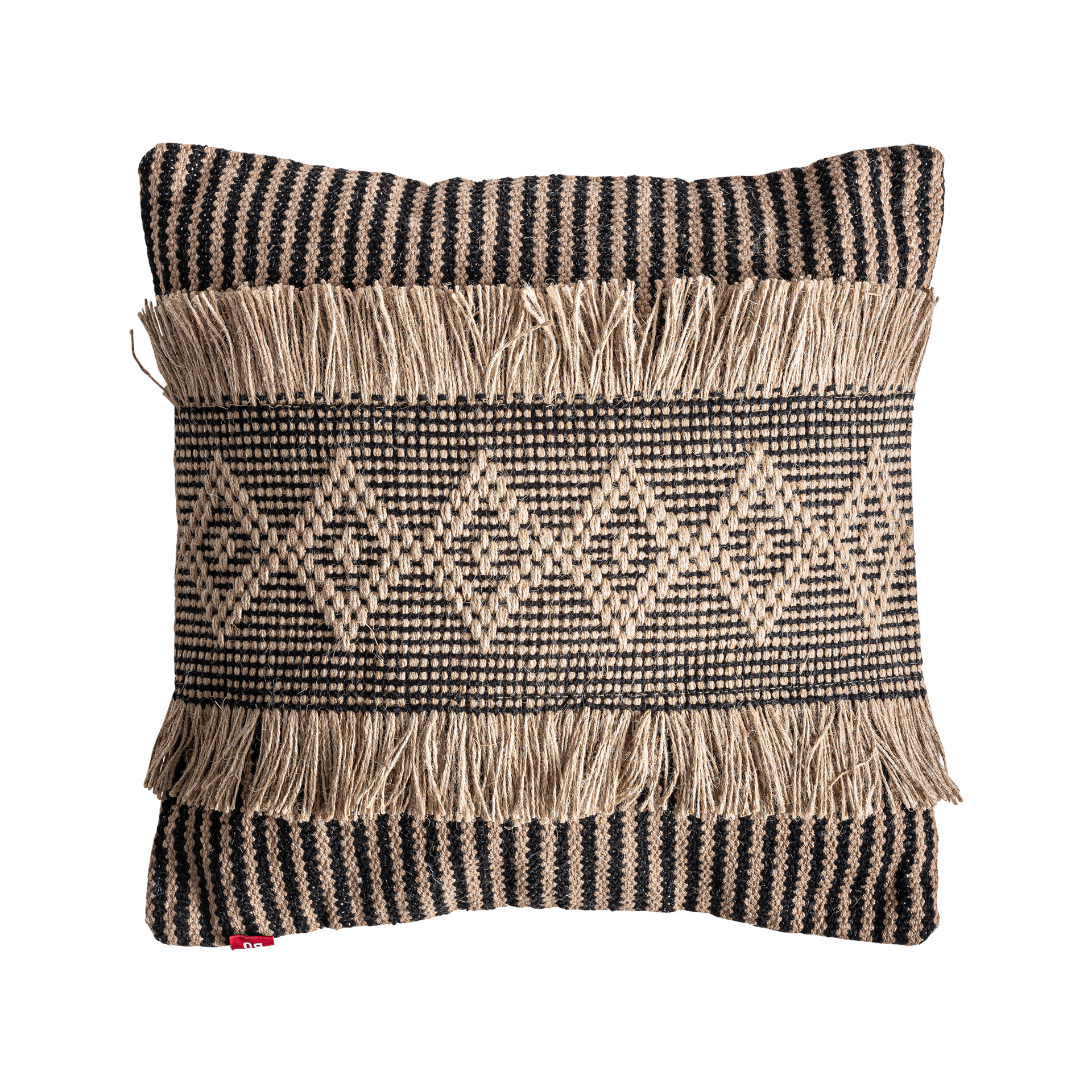 Cojín Blahir de estilo boho, fabricado en yute en color marrón claro, combinado con poliéster en color negro. Producto desenfundable.