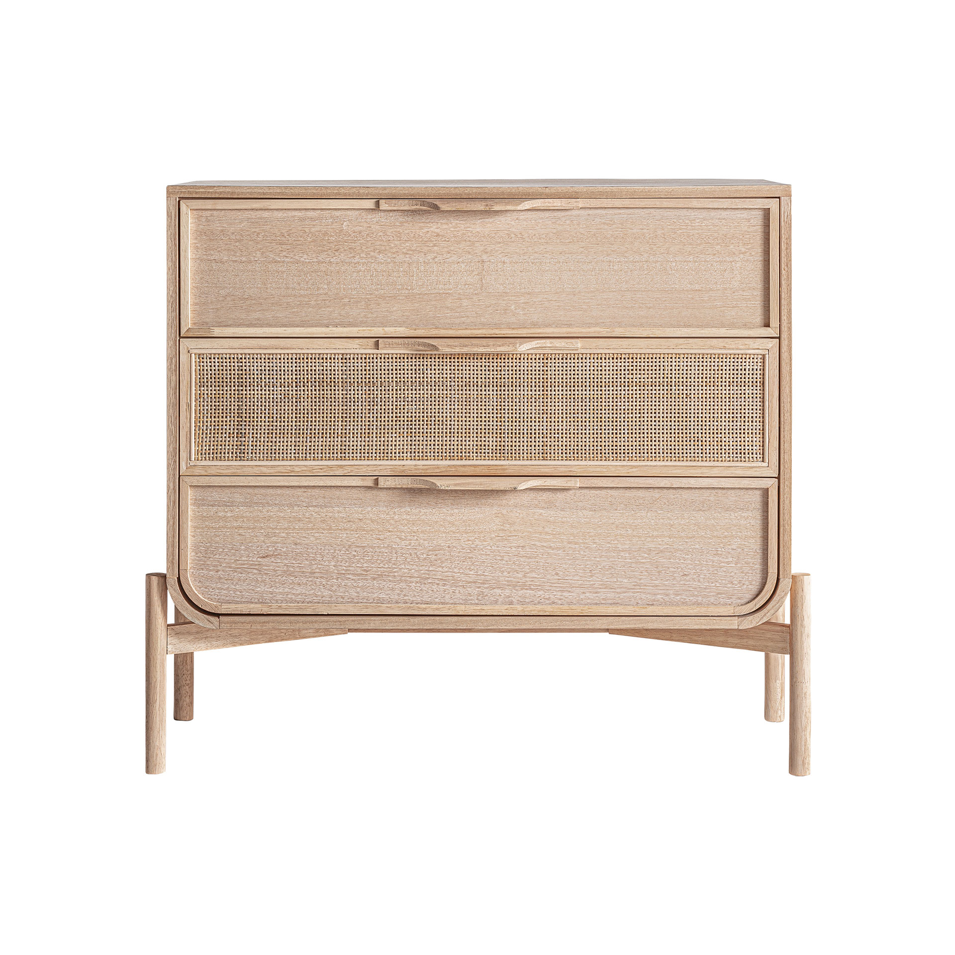 Cómoda rectangular weurtz de estilo nórdico, fabricado en madera de fresno en color marrón claro, combinado con ratán. Producto desmontable.