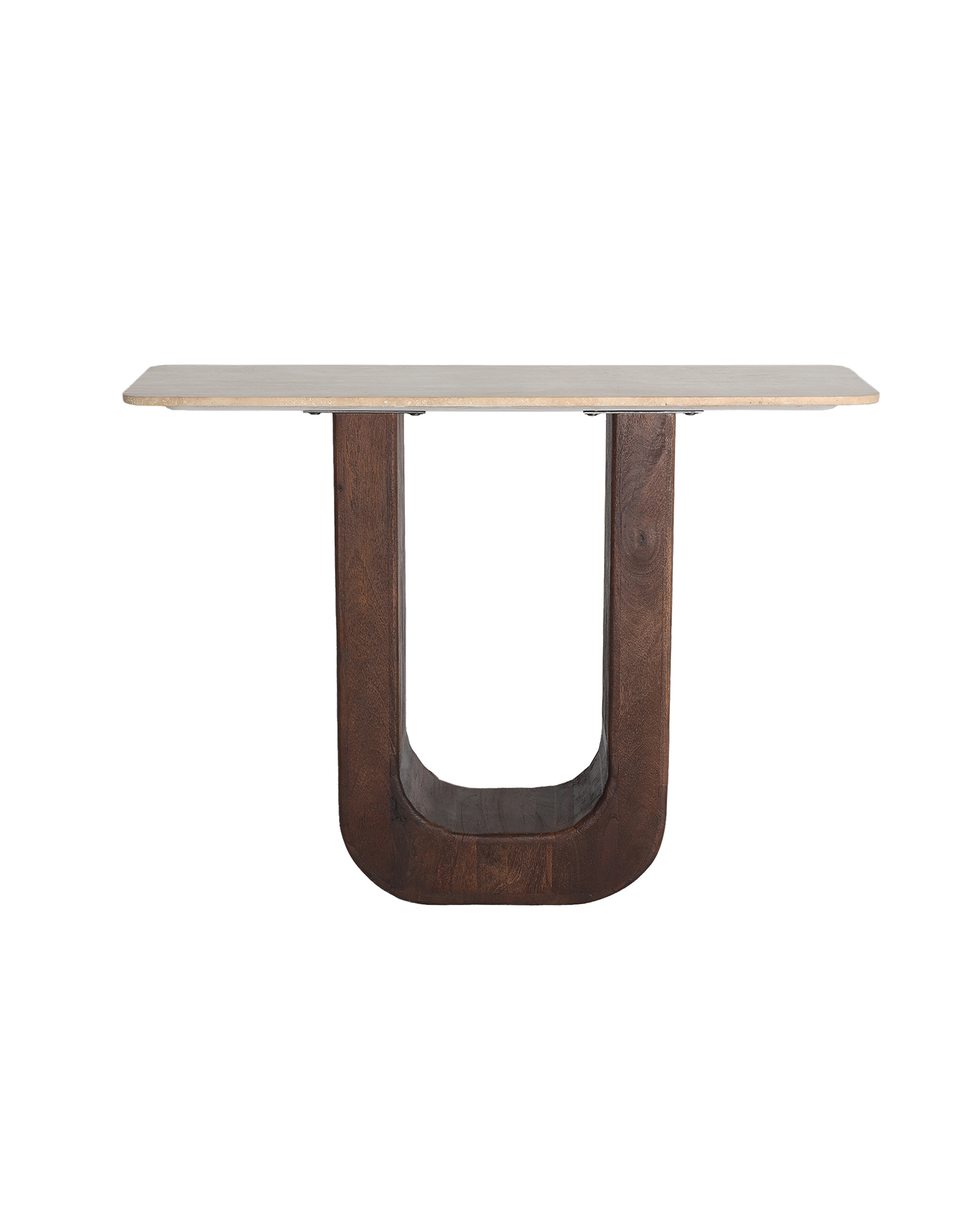 Consola Loop, fabricado en madera de mango en color marrón, combinado con mármol en color beige.