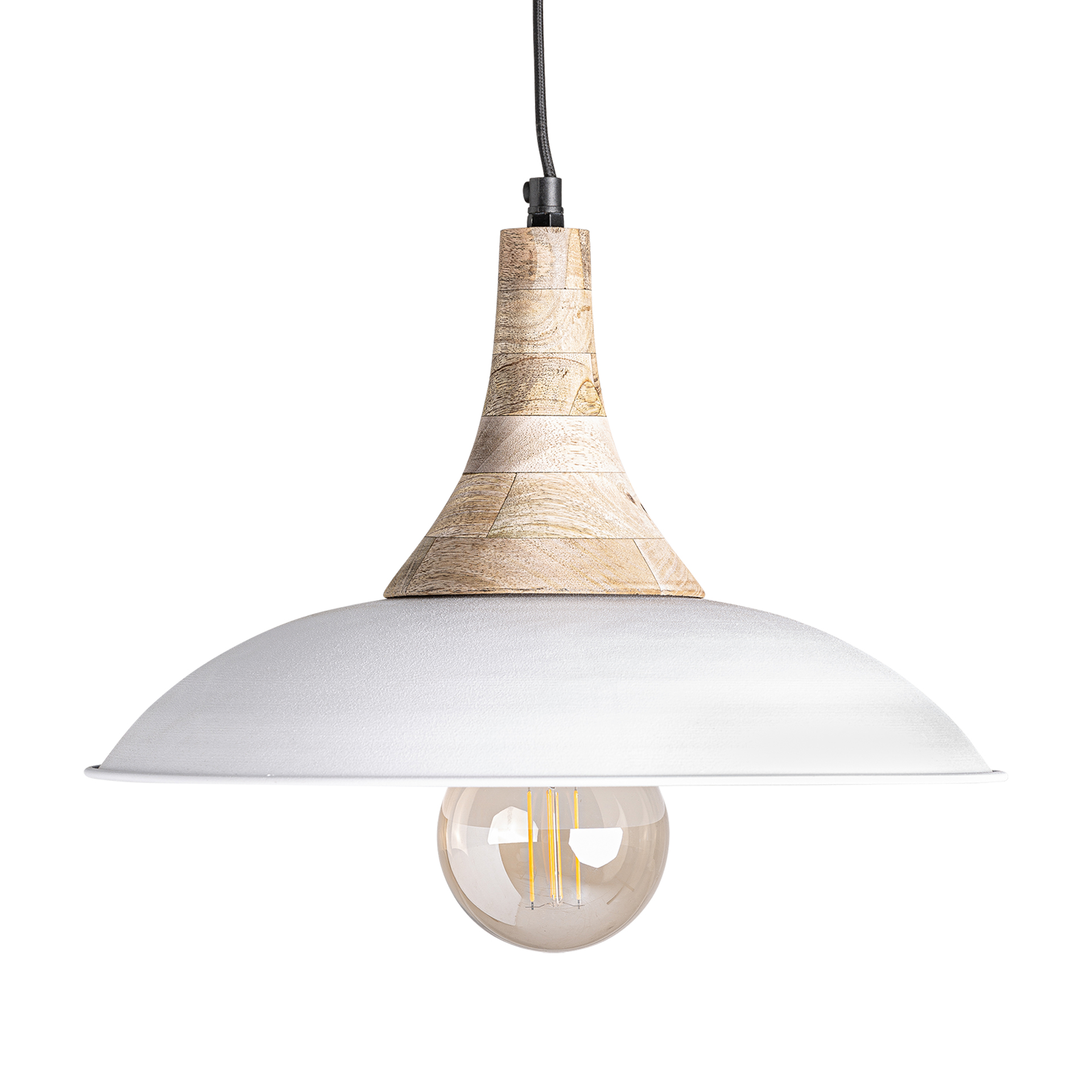 Lámpara de colgar redonda beck de estilo industrial, fabricado en hierro en color blanco, combinado con madera de mango en color natural.