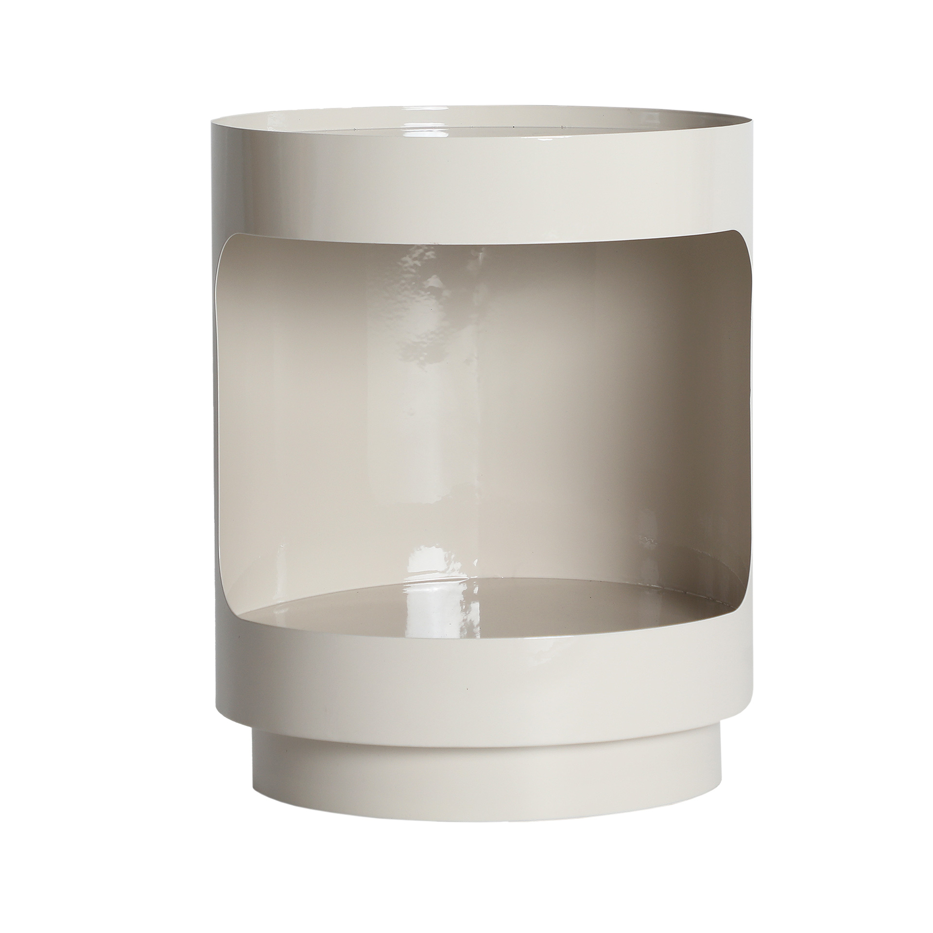 Mesita de noche Mist de estilo contemporáneo, fabricado en hierro en color blanco roto con acabado brillo.